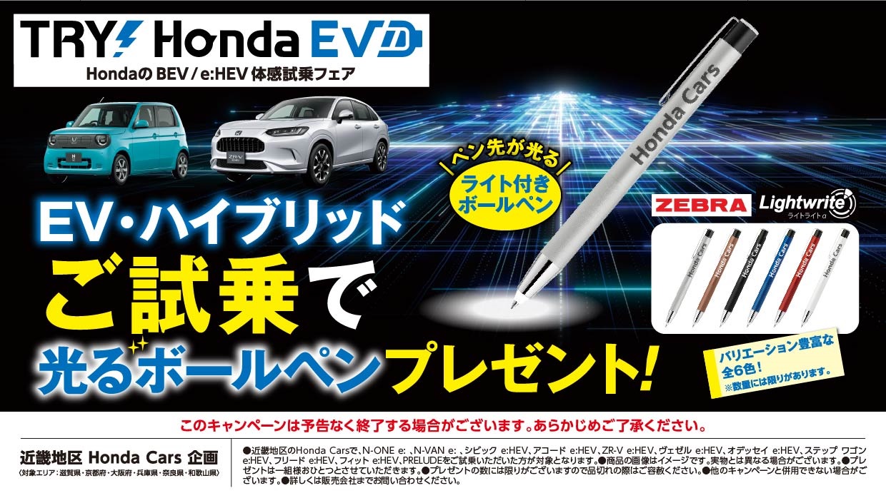 ●期間中に、近畿地区のHonda Cars 各店で、EV車、ハイブリッド車をご試乗いただいた方が対象です。